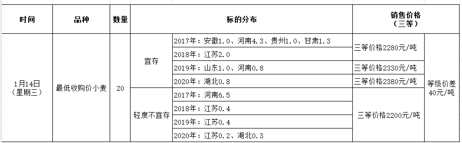 经国家有关部门研究决定,2026年1月14日8:30在国家粮食和物资储备局粮食交易协调中心及联网的各省级粮食交易中心组织开展最低收购价小麦竞价销售交易,请交易会员通过国家粮食交易中心官网(www.grainmarket.com.cn)“用户中心”,登录国家粮食交易平台,在专场列表中选择“国家政策性粮油竞价销售”参与交易。现就有关事项公告如下: