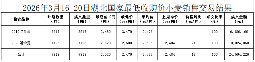 本周湖北省共投放最低收购价混合麦9813吨,全部成交,其中成交2019年混合麦2617吨,成交均价2476元/吨;成交2020年混合麦7196吨,成交均价2505元/吨,环比上涨21元/吨。