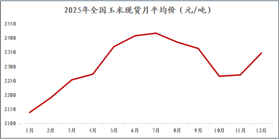 2025年国内玉米现货均价呈现“涨-跌-涨”的波段走势。预计2026年玉米现货价格重心上移,支撑主要来自华北玉米质量差的结构性变化以及CBOT玉米震荡回升预期,压力主要是陈粮投放及消费驱动不足。
