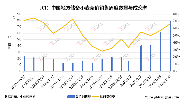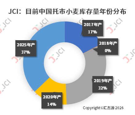 2026年起,我国最低收购价小麦拍卖时隔两年再度回归,截至2月初,托市麦已完成五轮拍卖,累计投放量110.2万吨,成交量77.56万吨,平均成交率70%,成交均价2362元/吨。投放区域主要集中在河南、江苏、安徽、湖北四省,河北、山东仅投放1—2周便因成交偏淡相继暂停。1月份托市麦周度投放量约20万吨,周度成交率维持在50%—80%区间;进入2月首周,周度投放量增至30万吨,成交率仍保持70%。由于当前托市麦底价按生产年份远近分档定价,陈粮底价偏低、新粮底价偏高,使得2017年产小麦成交量占比高达84%。据JCI推算,目前2017—2020年产托市麦剩余库存约2770万吨,叠加2025年新入库的1640万吨,国内托市麦总库存量约4410万吨。