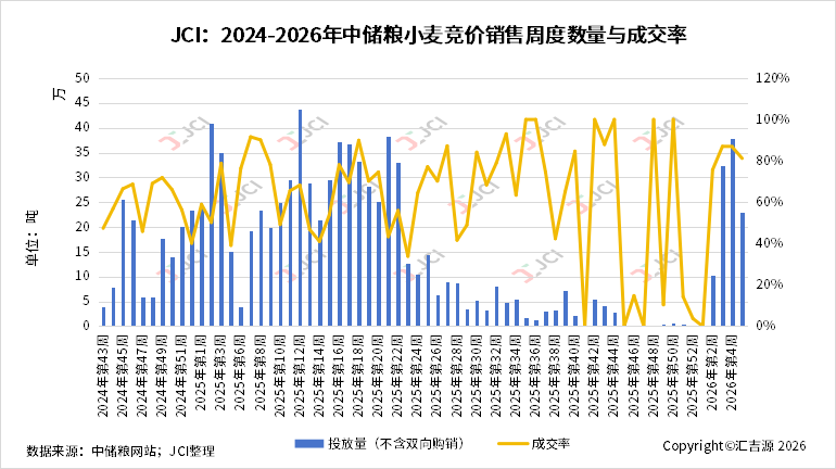 总体来看,2026年起我国最低收购价小麦、中央及地方储备小麦等政策性小麦竞拍呈现购销量价齐升、成交明显活跃的态势,标志着年度储备轮换工作已全面提速。当前投放的托市小麦因储存年限较长、底价偏高,难以完全替代新麦满足较高品质的制粉需求,叠加整体拍卖节奏温和、山东和河北暂停投放,因此对短期小麦现货市场行情的利空冲击有限。中长期而言,我国政策性小麦正加快陈粮去化、优化库存年限与品质结构,既为后续新粮收购腾挪有效仓容、稳定市场价格预期,也为统筹国内收储节奏与进口粮源布局奠定坚实基础。
