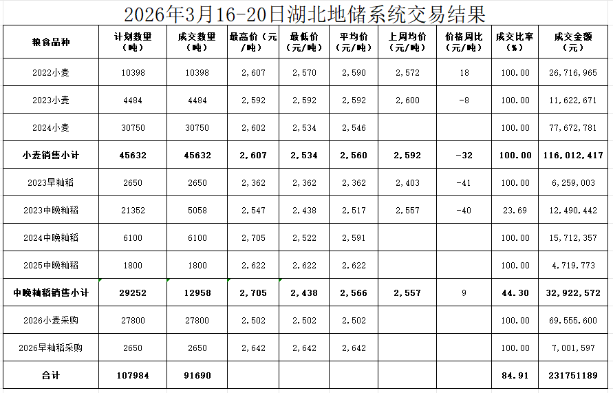 本周地储交易平台投放各类粮油107984吨,成交91690吨,成交率84.91%。其中销售成交地方储备2022年小麦10398吨,成交均价2590元/吨,环比上涨18元/吨;2023年小麦4484吨,成交均价2592元/吨,环比下跌8元/吨;2024年小麦(含购销双向销售)30750吨,成交均价2546元/吨;2023年中晚籼稻5058吨,成交均价2517元/吨,环比下跌40元/吨;2024年中晚籼稻6100吨,成交均价2591元/吨;2025年中晚籼稻1800吨,成交均价2622元/吨。购销双向成交早籼稻5300吨,2023年产销售成交均价2362元/吨,2026年产采购成交均价2642元/吨;成交小麦55600吨,2024年产销售成交均价2540元/吨,2026年产采购成交均价2502元/吨。