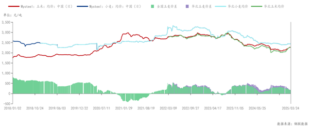 先说压力,华北小麦市场价格在2月底上涨了约40元/吨左右之后,已经横盘近一个月了。截至 3 月 20 日,全国玉米均价为 2265 元/吨,小麦均价为 2438 元/吨,玉米价格较小麦价格低 173 元/吨, 上周为172 元/吨;24日华北玉米均价为 2256 元/吨,华北小麦均价为 2435.2 元/吨,华北玉米价格较小麦价格低 179.2 元/吨, 上周为178.4 元/吨。