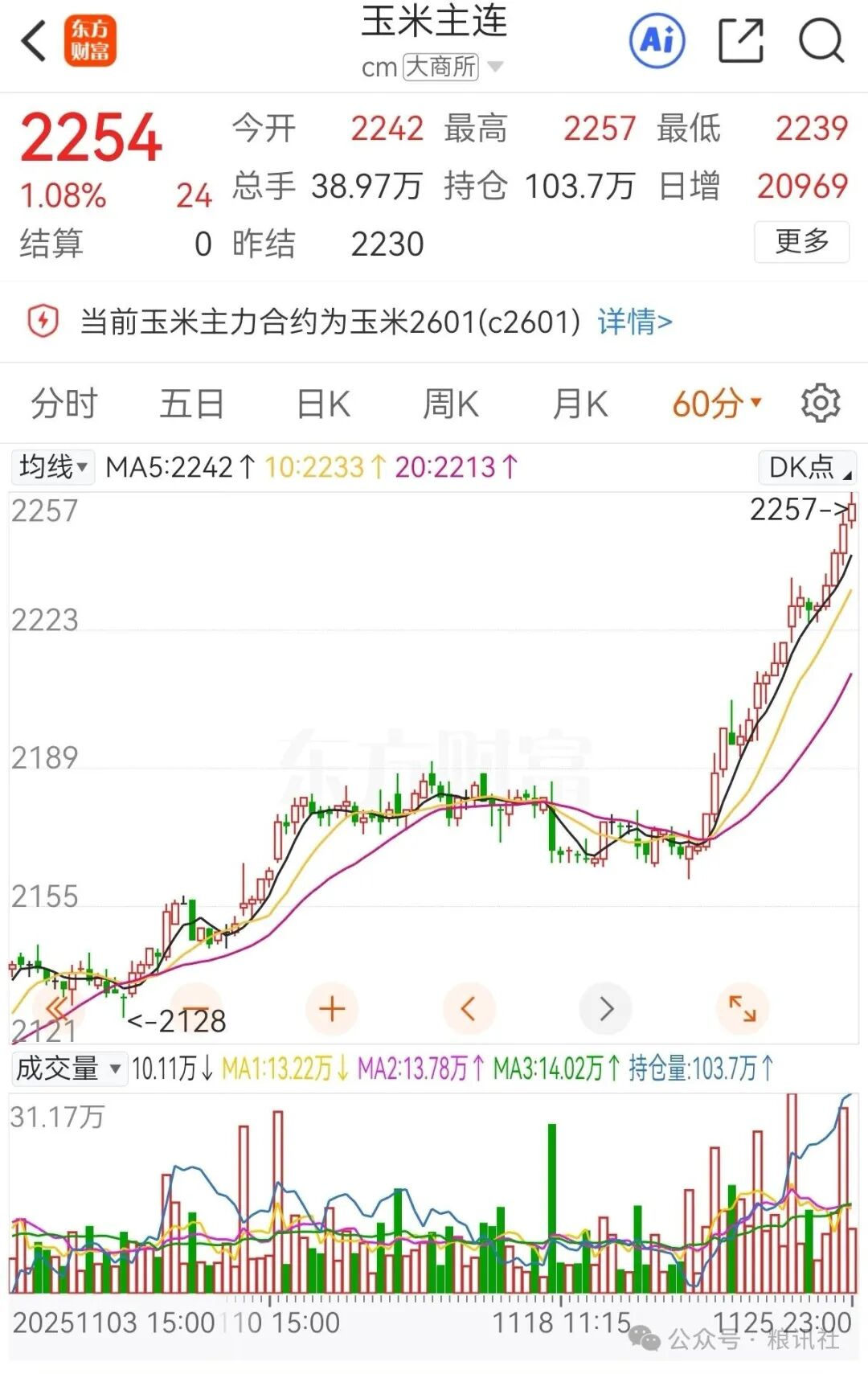 11月25日,大连玉米主力C2601合约以2254元/吨收盘、盘中冲高至2257元/吨,较前日结算价大涨36点——粮讯社监测数据显示,这一涨幅不仅创下7月下旬以来新高,更带动单日成交量突破79万手、持仓量增至103万手,资金净流入超1.6亿元。期现市场的“共振狂欢”背后,粮讯社通过一线调研、数据拆解,发现这场涨势是短期情绪与中长期压力的激烈碰撞:表面是供需紧平衡,实则是成本顶与累库预期的“冰与火”。