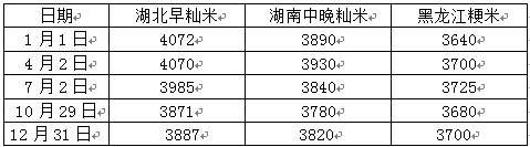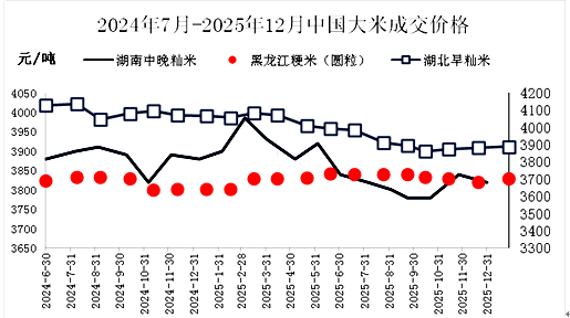 据监测,截至2025年12月31日,湖北早籼米批发价为3887元/吨,湖南中晚籼米主流成交价为3820元/吨,黑龙江粳米主流成交价为3700元/吨,分别比2025年初下跌185元/吨、下跌70元/吨、上涨60元/吨,分别比10月底上涨16元/吨、40元/吨、20元/吨。