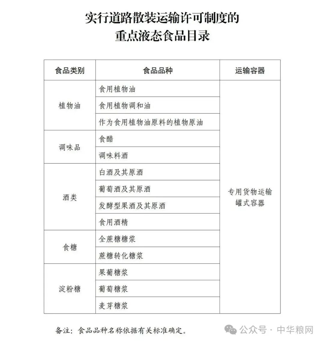 市场监管总局、交通运输部、国家粮食和物资储备局以联合公告形式发布的《实行道路散装运输许可制度的重点液态食品目录》明确将5大类14小类液态食品纳入准运许可管理范围,包括植物油、调味品、酒类等,同时明确规定运输容器为专用货物运输罐式容器。