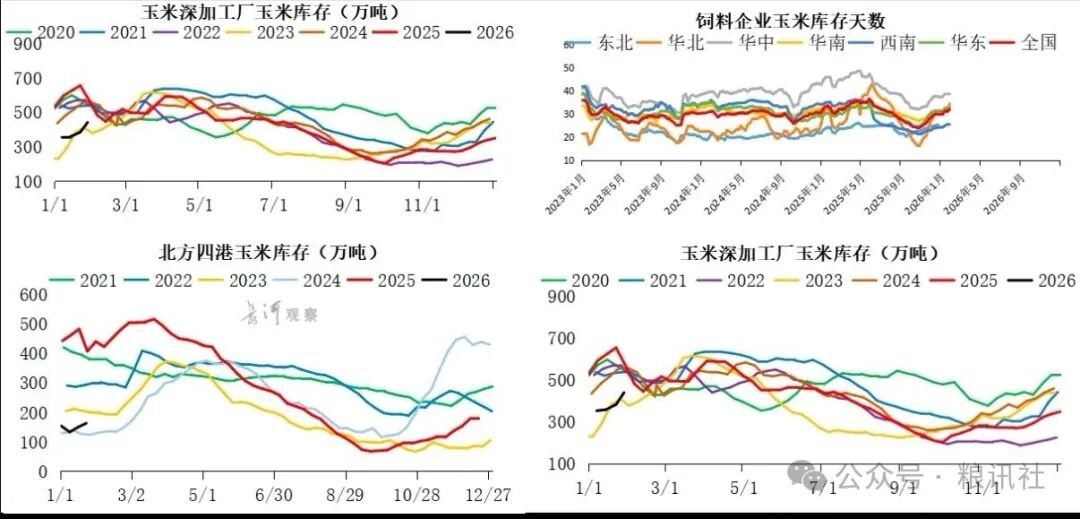 库存方面,粮讯社监测数据显示,当前基层粮源剩余约30%,同比处于低位,后续难以形成集中卖压;港口库存表现分化,截至2026年1月30日,北方八港玉米库存213万吨左右,广东港口玉米库存58万吨,港口整体库存同比及近四年均值均显著偏低,对现货价格形成一定支撑。而深加工企业库存则连续五周攀升,截至2月4日全国96家主要玉米加工企业玉米库存总量512.7万吨,增幅16.39%,东北产区深加工企业库存增幅更是达到20%左右,粮讯社认为,深加工企业库存的持续累积,一定程度上缓解了产区的粮源供应压力,也成为东北产区现货价格走弱的重要原因。