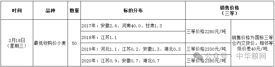 根据国家粮食交易中心公告:2026年3月18日最低收购价小麦将竞价销售2017-2020年小麦50万吨,周比增加20万吨,同时放开交易资格,市场参与范围扩大。具体交易安排如下: