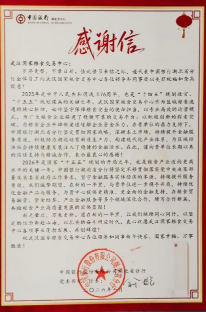 信中指出,过去一年,武汉国家粮食交易中心作为区域粮食流通的核心枢纽,始终坚守保障粮食安全的使命担当,以专业高效的运营模式为粮食企业搭建了稳健可靠的交易平台,积极创新融资服务模式,有效缓解企业资金压力。在中国银行湖北省分行贯彻国家战略、服务粮食产业实体经济的过程中,交易中心提供了鼎力支持与精诚合作。