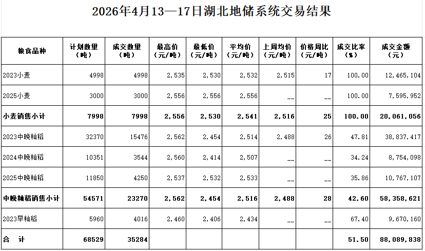 本周我省地储交易平台投放各类粮油68529吨,成交35284吨,较上周增加17569吨,成交率51.5%。其中销售2023年小麦4998吨,成交均价2532元/吨,环比上涨17元/吨;2025年小麦3000吨,成交均价2556元/吨;2023年中晚籼稻15476吨,成交均价2514元/吨,环比上涨26元/吨;2024年中晚籼稻3544吨,成交均价2507元/吨;2025年中晚籼稻4250吨,成交均价2533元/吨;2023年早籼稻4016吨,成交均价2434元/吨。